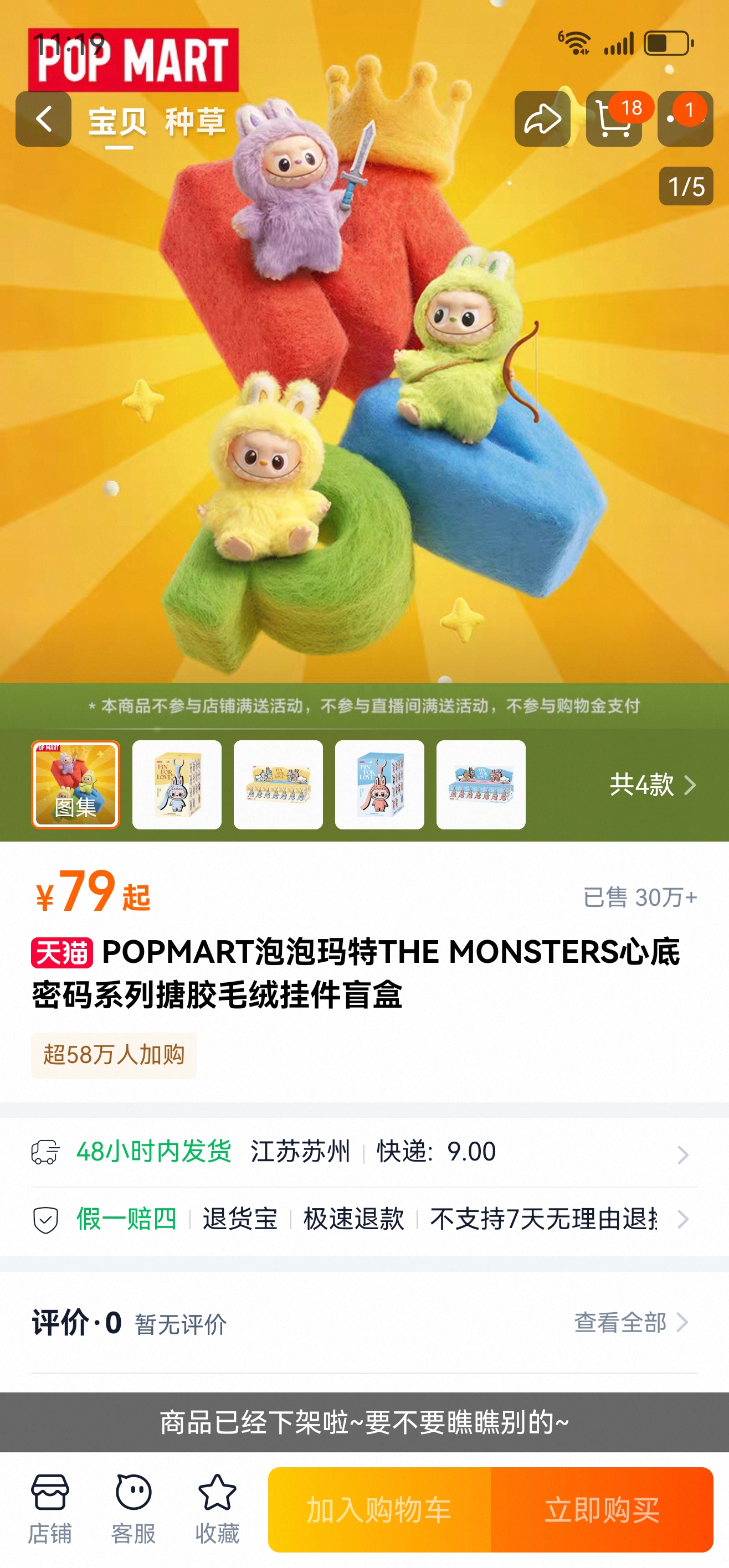 据天猫泡泡玛特旗舰店显现,今晚开售的迷你版LABUBU老例款已售30万+,超58万东说念主加购,显现“商品仍是下架”。